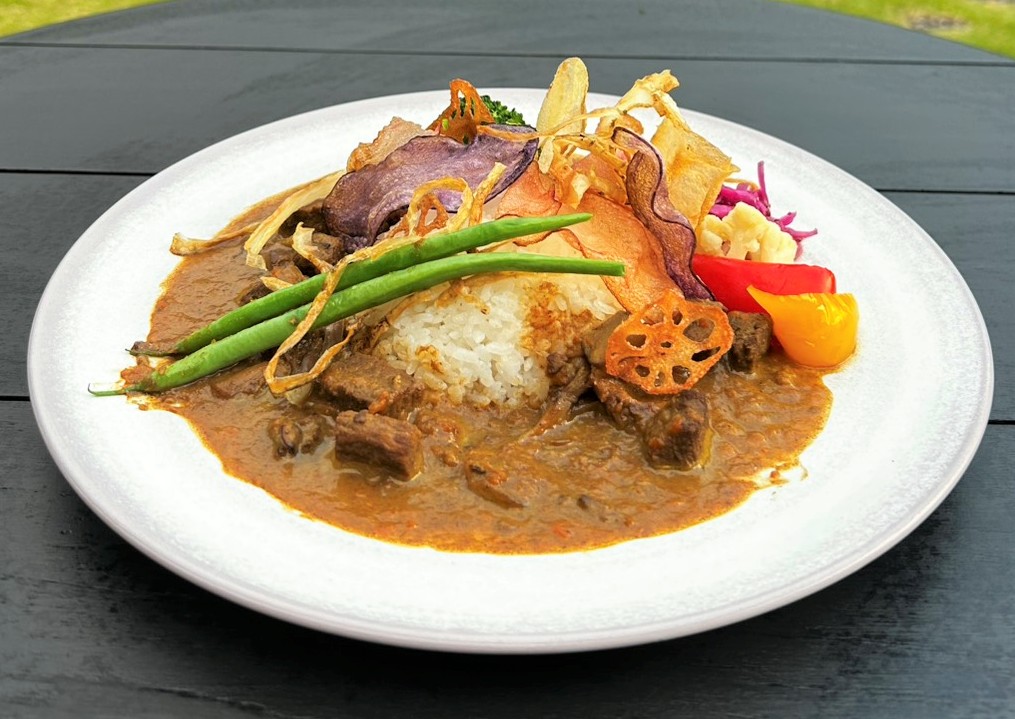 旨み溢れる飛騨牛を使ったカレーの上に美しく盛り付けた彩り野菜チップ。食感も楽しい菊水オリジナルカレーをぜひ。
